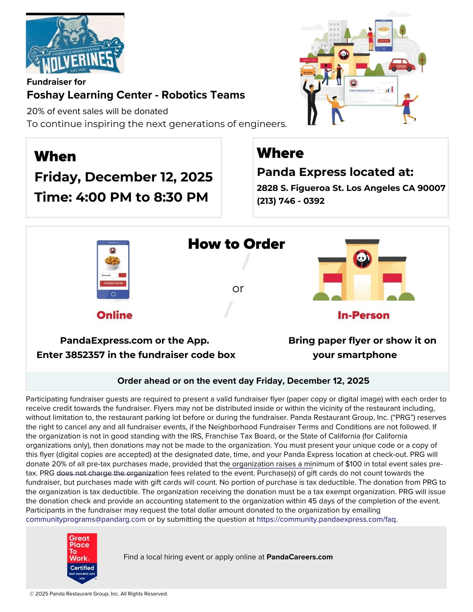 A Quick Break from Finals! Support Foshay Robotics at Panda Express on Friday, 12/12/25 (anytime 4p~8:30p) Print